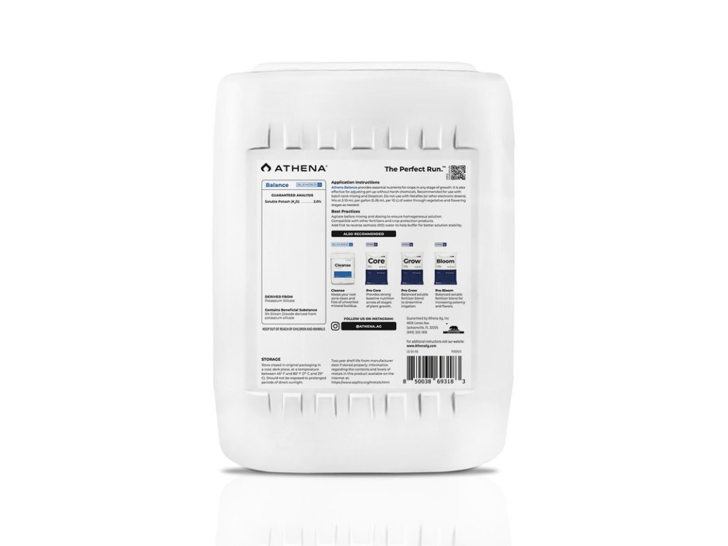 Athena Balance ist eine einfache Formel aus Kaliumsilikat, die speziell konzentriert wurde, um Bewässerungswasser zu puffern und auf den idealen pH-Wert zu stabilisieren. Silizium fördert außerdem das Pflanzenwachstum, die Struktur der Stängel, reduziert Stress und fördert die Nutzung von Wasser (Osmoregulation) und Nährstoffen.