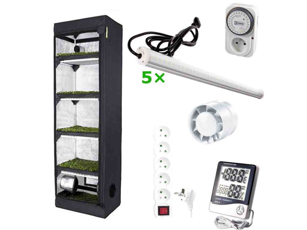 Das Anbauzelt hat die Maße 60x40x200 cm und ist somit ideal für die Vorzucht oder den Anbau von Microgreens. Der Growbox nimmt nicht viel Platz ein und passt problemlos auch in eine Wohnung. Neben Lichtern, Thermometer und Timer finden Sie im Set auch einen kleinen Lüfter zum Abzug der Luft.