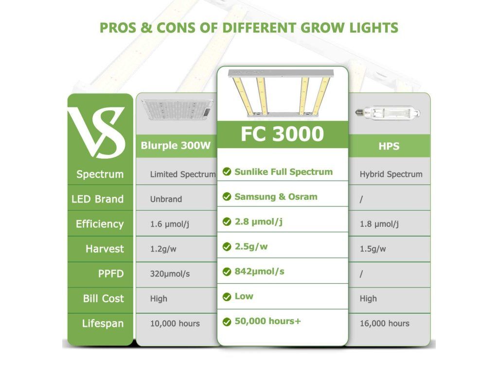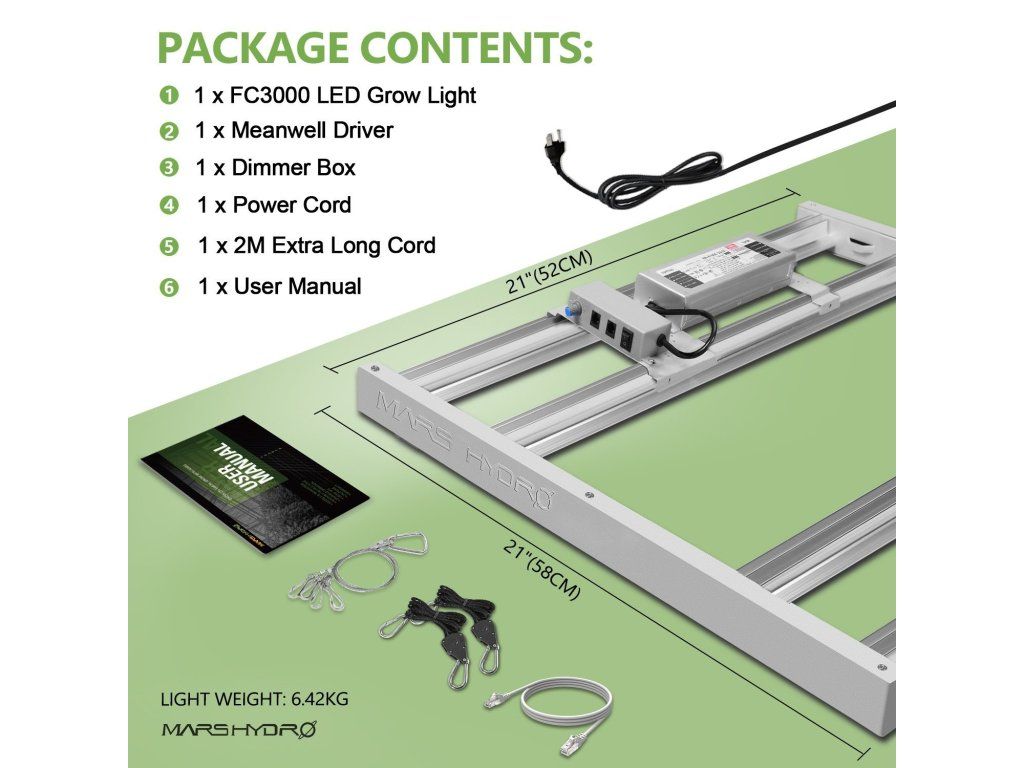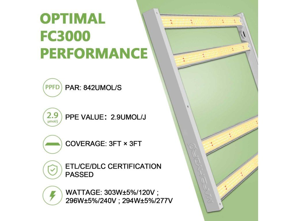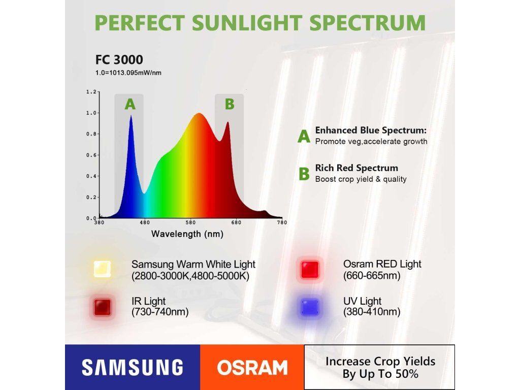 Die MARS HYDRO FC3000 LED GROW Leuchte verwendet 896 Samsung LM301B LEDs. Zur Kühlung verwendet das Gerät einen Aluminiumkühlkörper, der eine Überhitzung zuverlässig verhindert und die Umwelt nicht mit Lärm belastet. Die LED-Wachstumsleuchte erzeugt eine Vollspektrum-Beleuchtung, die das Sonnenlicht besser simuliert und den Pflanzen bessere Bedingungen bietet. Die Wasserdichtigkeit des Netzteils ist IP65, was Schäden in nassen Umgebungen verhindert.