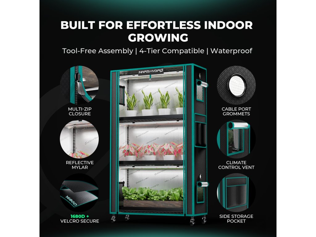 • All-in-One Controlled Environment: Der Metallrahmen und das geschlossene Zelt sorgen für eine stabile Feuchtigkeit und Temperatur, während die Vollspektrum-LED-Leuchten das natürliche Sonnenlicht nachahmen, wodurch der Einfluss vom Wetter und von den Jahreszeiten eliminiert wird.