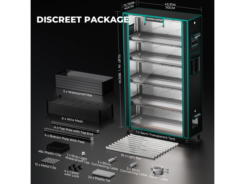Mars Hydro komplettes Anbau-Box-Set für Vorzucht, 6 Etagen (110cm x 40cm x 180cm) ist eine allumfassende Indoor-Grow-Lösung mit einem Metallrahmen und einem vollständig geschlossenen Zelt. Integrierte Vollspektrum-LED-Leuchten(250W) ahmen die natürliche Sonne nach, um optimales Pflanzenwachstum zu gewährleisten. Die mehrstöckigen Regale ermöglichen den simultanen Anbau von Kräutern, Blattgemüse und Blumen. Dank Rollen ist es leicht zu bewegen und ideal für kleine Räume, Wohnungen oder Büros.