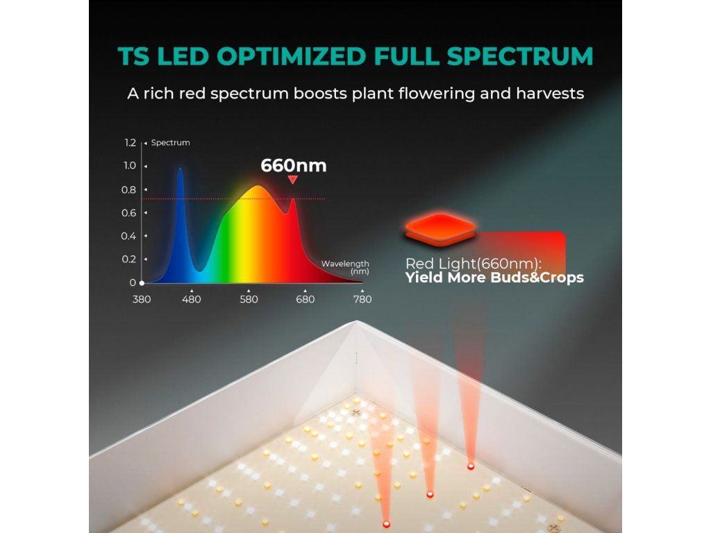 Die MARS HYDRO TS1000 ist mit 324 EPISTAR LED-Chips ausgestattet, die eine Leistung von 150 W erzeugen. Diese GROW-Leuchte verwendet weiße LEDs (Mix 3000 - 6800 K), die das natürliche Sonnenlicht perfekt simulieren und die Pflanzen mit den notwendigen Nährstoffen versorgen. Gleichzeitig sind diese SMD-LEDs bei gleicher Lichtstärke weniger stromhungrig, so dass die Grow-Leuchte nicht mit einem lauten Lüfter zur Kühlung hoher Temperaturen ausgestattet werden muss. Das reflektierende Design der Leuchte passt perfekt in alle Growboxen und fördert die Lichtreflexion.