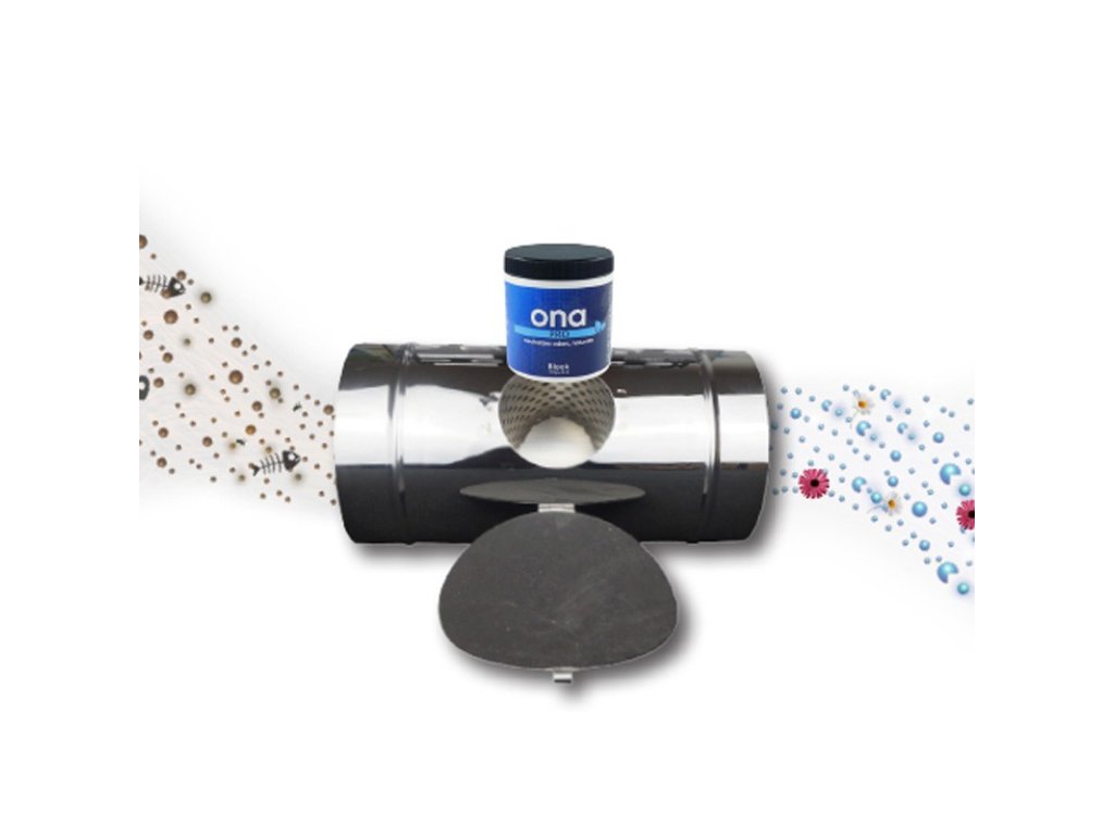 Der Anschluss wird hinter dem Abluftventilator installiert und in die Öffnung können je nach Bedarf mehrere Stücke ONA Block eingesetzt werden. Alle unerwünschten Gerüche werden so effizient und schnell entfernt, noch bevor sie aus der Leitung austreten.