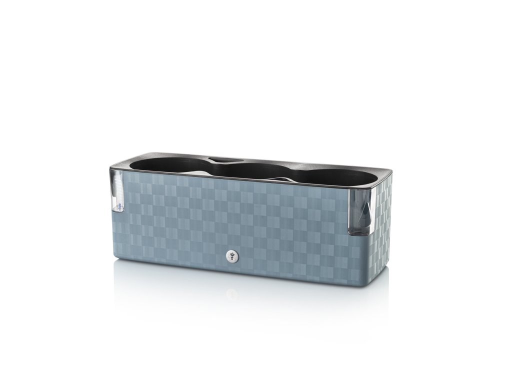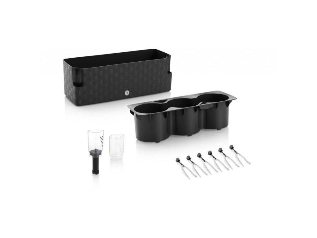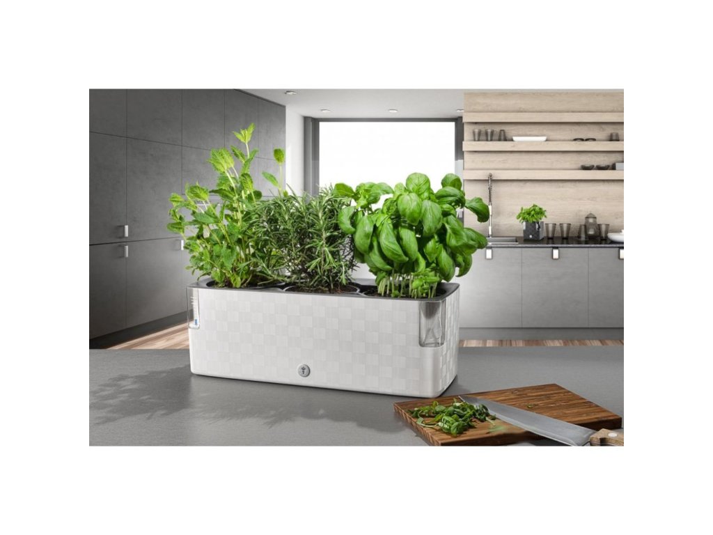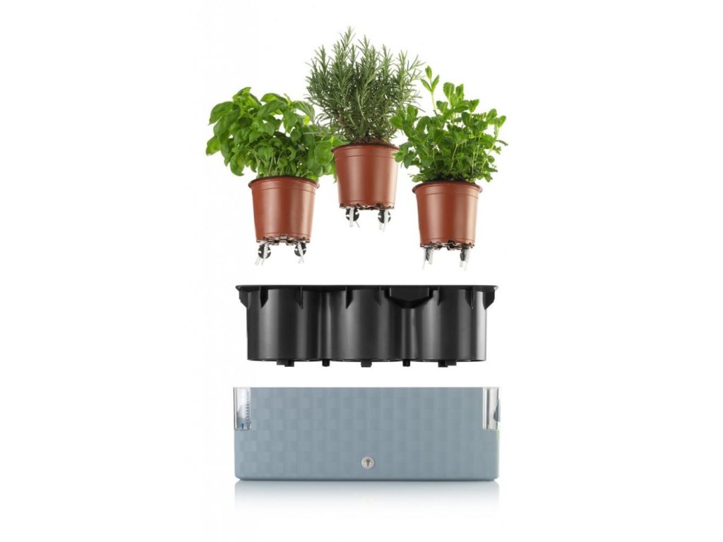 Das Plastkon Cobble Trio beinhaltet drei smarte Blumentöpfe mit Dochtbewässerung, die sich optimal für den Anbau von Kräutern und Blumen zuhause eignen. Sie passen perfekt auf die Fensterbank, den Balkon oder die Terrasse. Die Maße sind 39,7x14x14 cm.