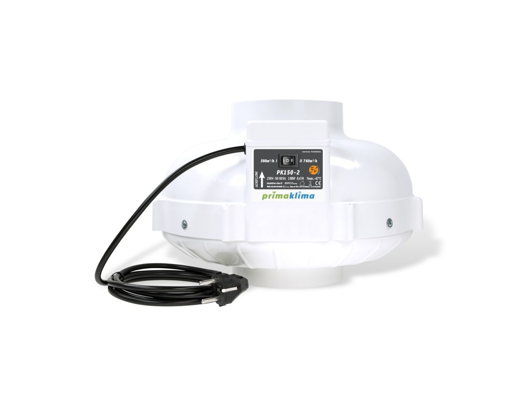 Prima Klima PK150-2 ist ein zweistufiger Rohrventilator mit einem hocheffizienten AC-Motor von ebm-papst und einem Laufrad mit rückwärts gekrümmten Schaufeln. Er bietet einen maximalen Luftdurchsatz von 390 / 760 m3/h bei gleichzeitiger ruhiger und gleichmäßiger Laufruhe. Das robuste Gehäuse aus nicht brennbarem Polyamid garantiert eine lange Lebensdauer und einen sicheren Betrieb. Wartungsfreie Kugellager tragen zu minimalen Vibrationen und geringer Geräuschentwicklung bei.