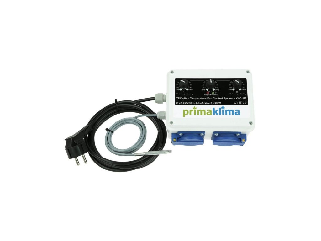 Der Controller Prima Klima Trio-2M ermöglicht eine automatische Steuerung der Lüfter abhängig von der Temperatur. Wenn die eingestellte Temperatur überschritten wird, laufen beide Lüfter auf maximaler Leistung und kühlen den Raum ab. Fällt die Temperatur unter den eingestellten Wert, regeln die Lüfter die Temperatur zurück auf den eingestellten Mindestwert. Ein einfaches und intelligentes Gerät mit hoher Effizienz. Feuchtigkeitsklasse: IP54. Temperaturregelbereich: 20 °C - 30 °C. Hysterese: 2 °C. Sensor Toleranz: 0,2°C. Maximale Leistung 2x 300 W bei 220/230 V 50 Hz.