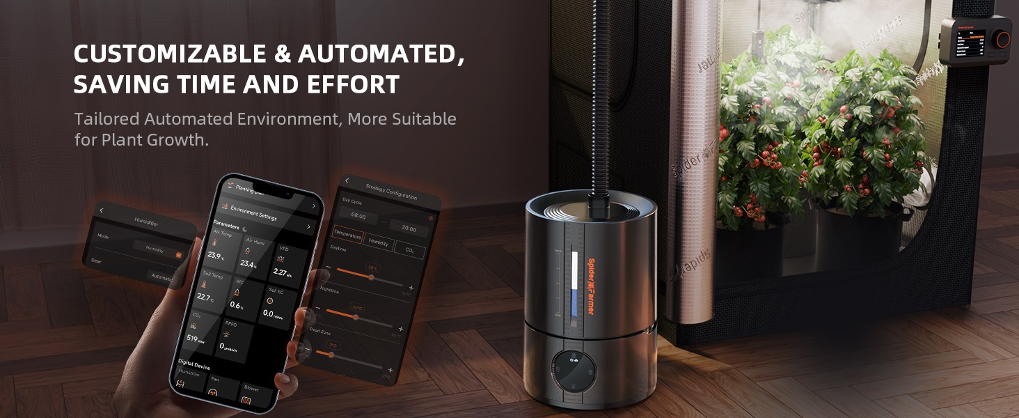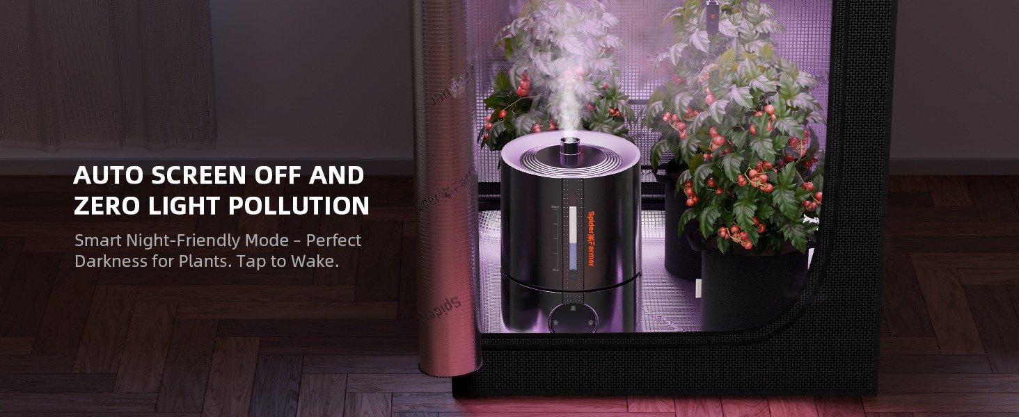 Überwacht Temperatur, Luftfeuchtigkeit und Tag/Nacht-Zyklen im Growzelt. Hilft, optimale Bedingungen für schnelleres und gesünderes Pflanzenwachstum aufrechtzuerhalten. - Leiser und effizienter 5L-Nebelausstoß