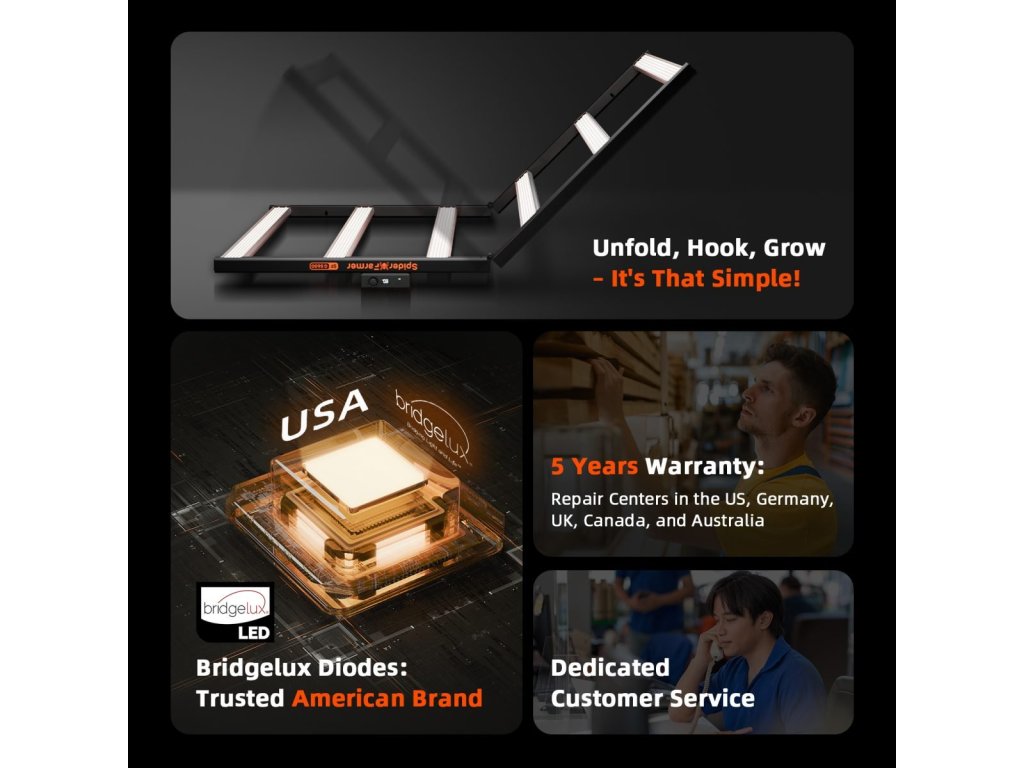 Spider Farmer verwendet LED-Dioden von Bridgelux, einer bekannten amerikanischen Marke mit über 20 Jahren Erfahrung. Diese Technologie bietet hohe Effizienz und lange Lebensdauer, wobei Züchter einen stabilen Betrieb auch nach mehr als 3 Jahren Gebrauch melden.