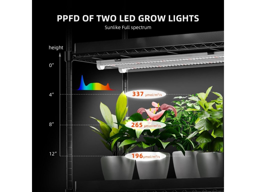 - Vollspektrumlicht mit integrierten Reflektoren – erhöht die Effizienz, fördert das gesunde Wachstum der Pflanzen und schützt Ihre Augen.