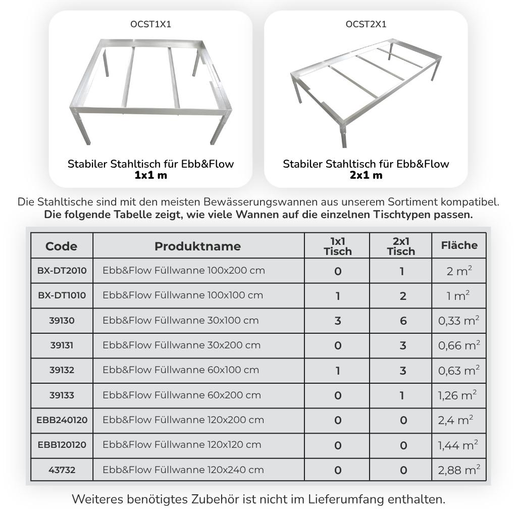 Dieser Tisch ist kompatibel mit ausgewählten Bewässerungswannen Ebb&Flow aus unserem Sortiment: